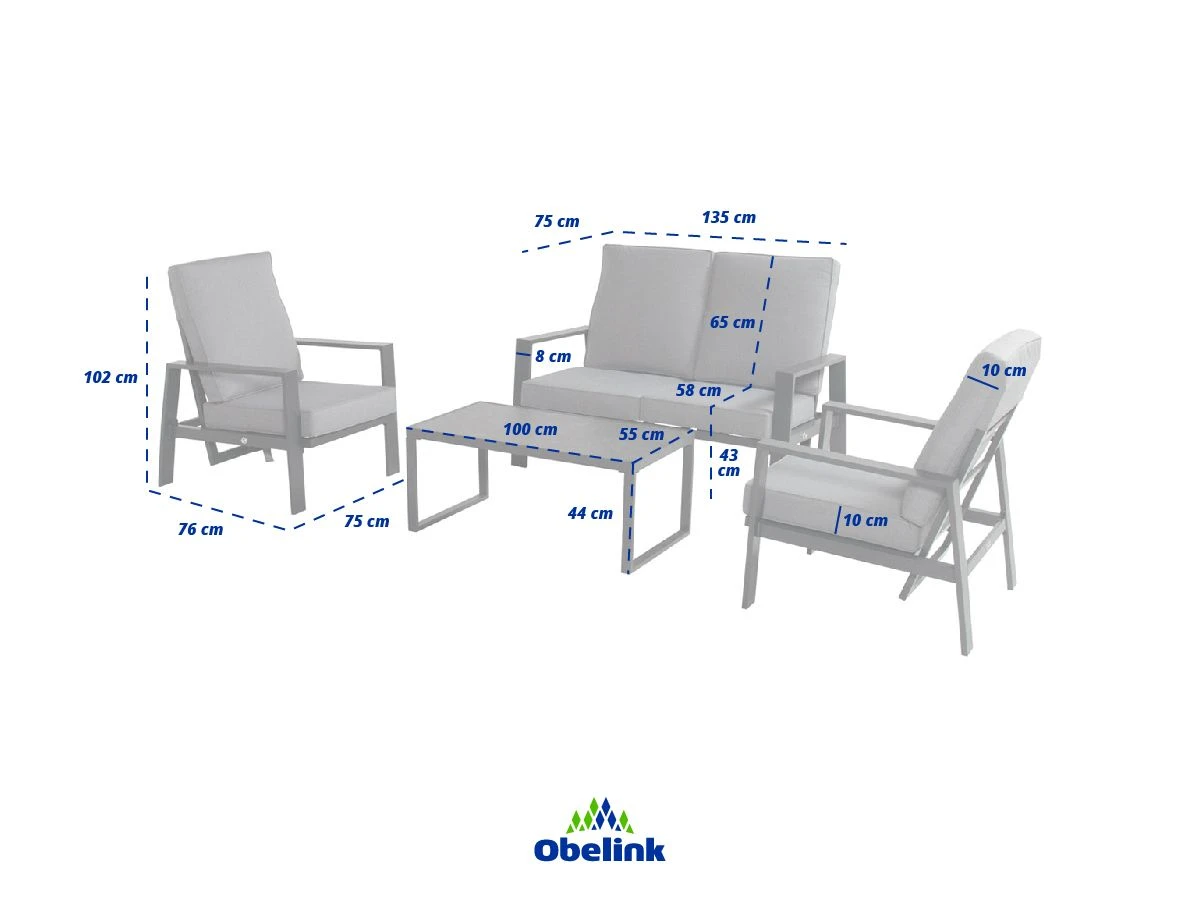 De Cornbury bestaat uit een 2-zitsbank, 2 loungestoelen en een salontafel. De loungeset wordt geleverd inclusief hoogwaardig loungekussens, voorzien van een ritssluiting.