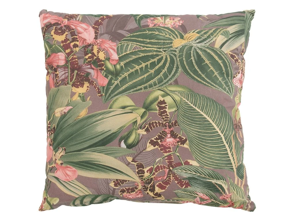 Het Elle Cassis sierkussen is voorzien van een vrolijk dessin van tropische planten op een paarse ondergrond.