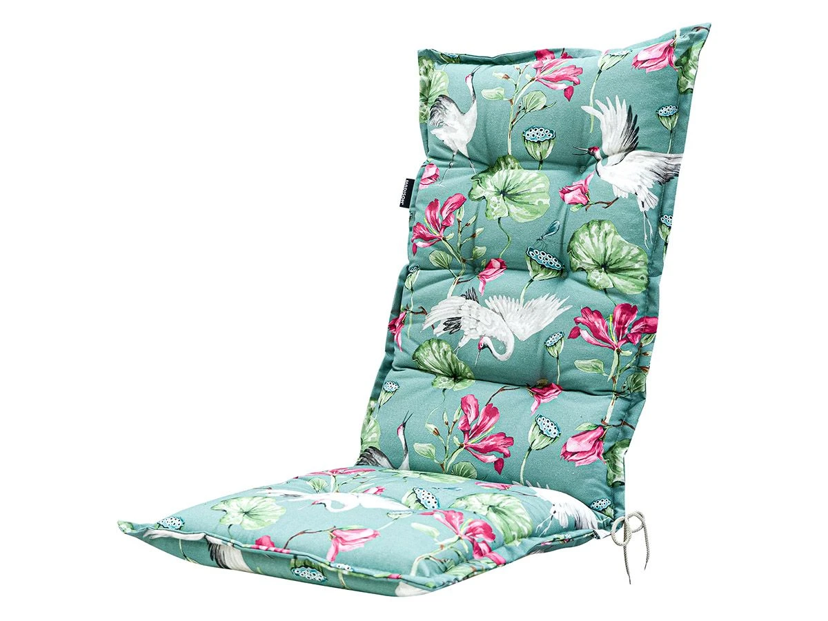 Dankzij de verstelbare band en touwtjes blijft het kussen goed op zijn plek zitten. Daarbij is het tuinkussen met hoge rug voorzien van ingenaaide knopen en een volant om het geheel af te maken.