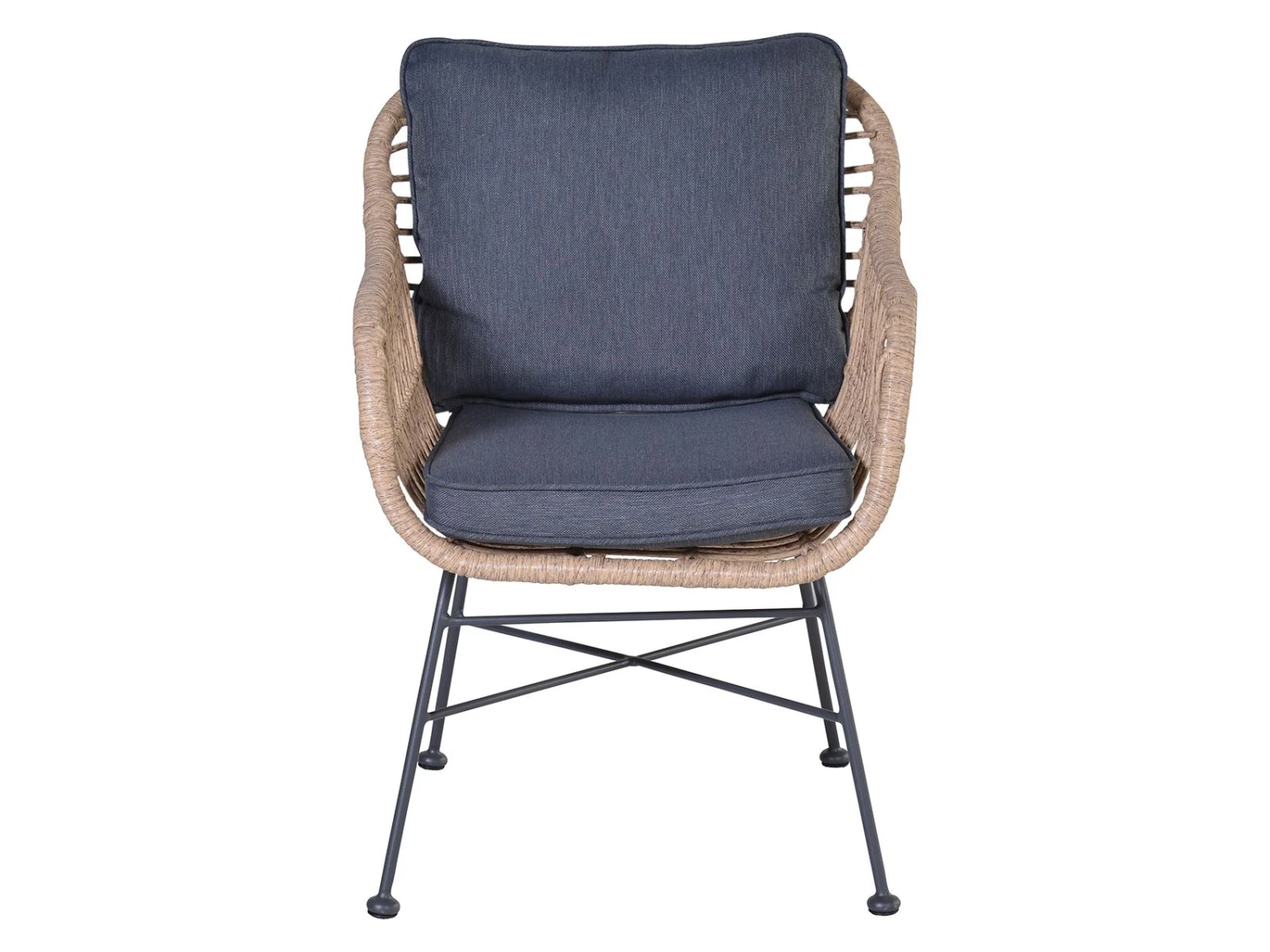 Deze mooie kuipstoel is vervaardigd uit een gecoat stalen frame met daaromheen een kunststof vlechtwerkdraad. Tussen de gevlochten wickerdraden zit een kleine ruimte zodat de kuip zeer ruimtelijk oogt. De poten zijn gemaakt van staal en zijn kras en stootvast. Voor extra zitcomfort is de stoel uitgerust met een donker grijs zit en rug kussen.