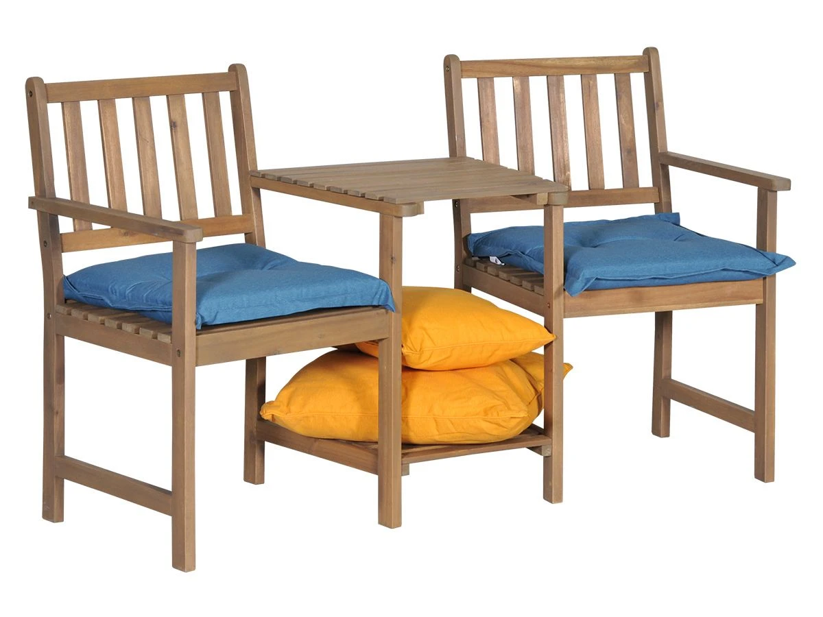 De loveseat is gemaakt van acaciahout, afgewerkt met een teak look. De totale breedte van de bank is ongeveer 156 centimeter.
