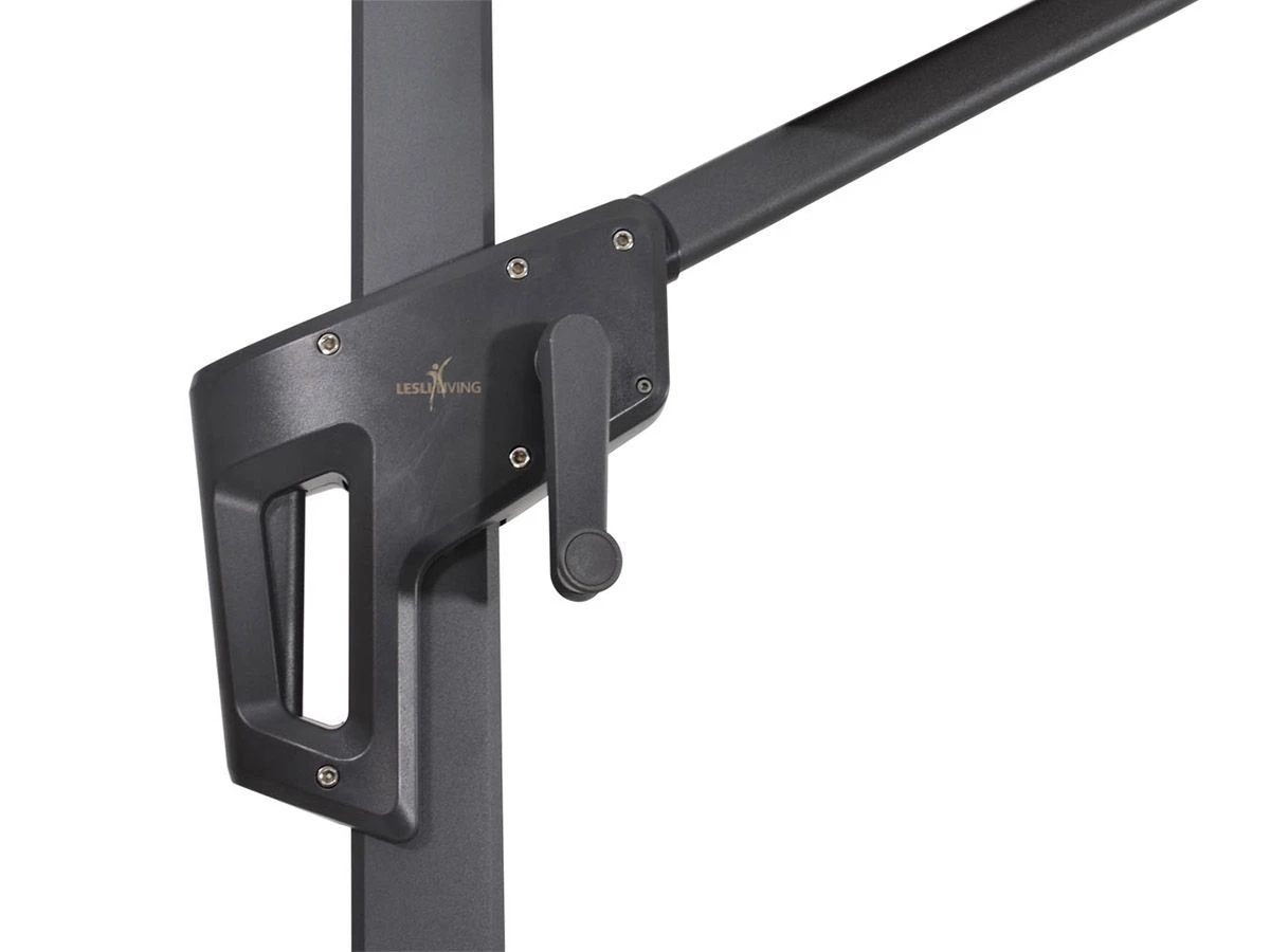 Het frame is van aluminium. Het doek is gemaakt van 100% polyester, 250gr/m2 met een PA coating waardoor het doek waterafstotend is. Een klein regenbuitje is dus geen probleem voor deze parasol. Je hebt de keuze uit de kleuren antraciet, taupe en ecru. De parasol wordt geleverd exclusief voet.