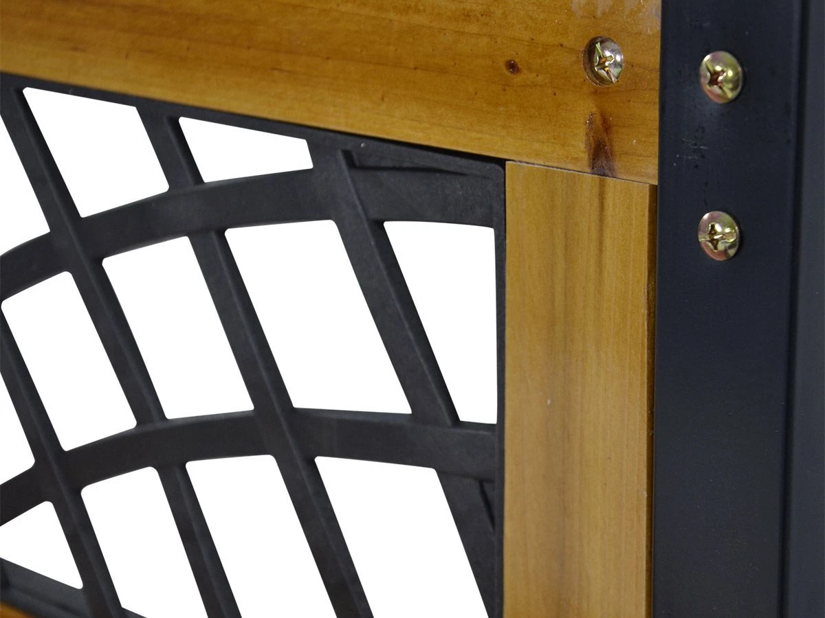 Het frame is van metaal met daarop een zitting en rugleuning van hardhout. In de rugleuning zit een zwarte PVC inleg voor een mooi speels effect. Door het gebruik van deze materialen in de tuinbank onderhoudsvriendelijk en weerbestendig.